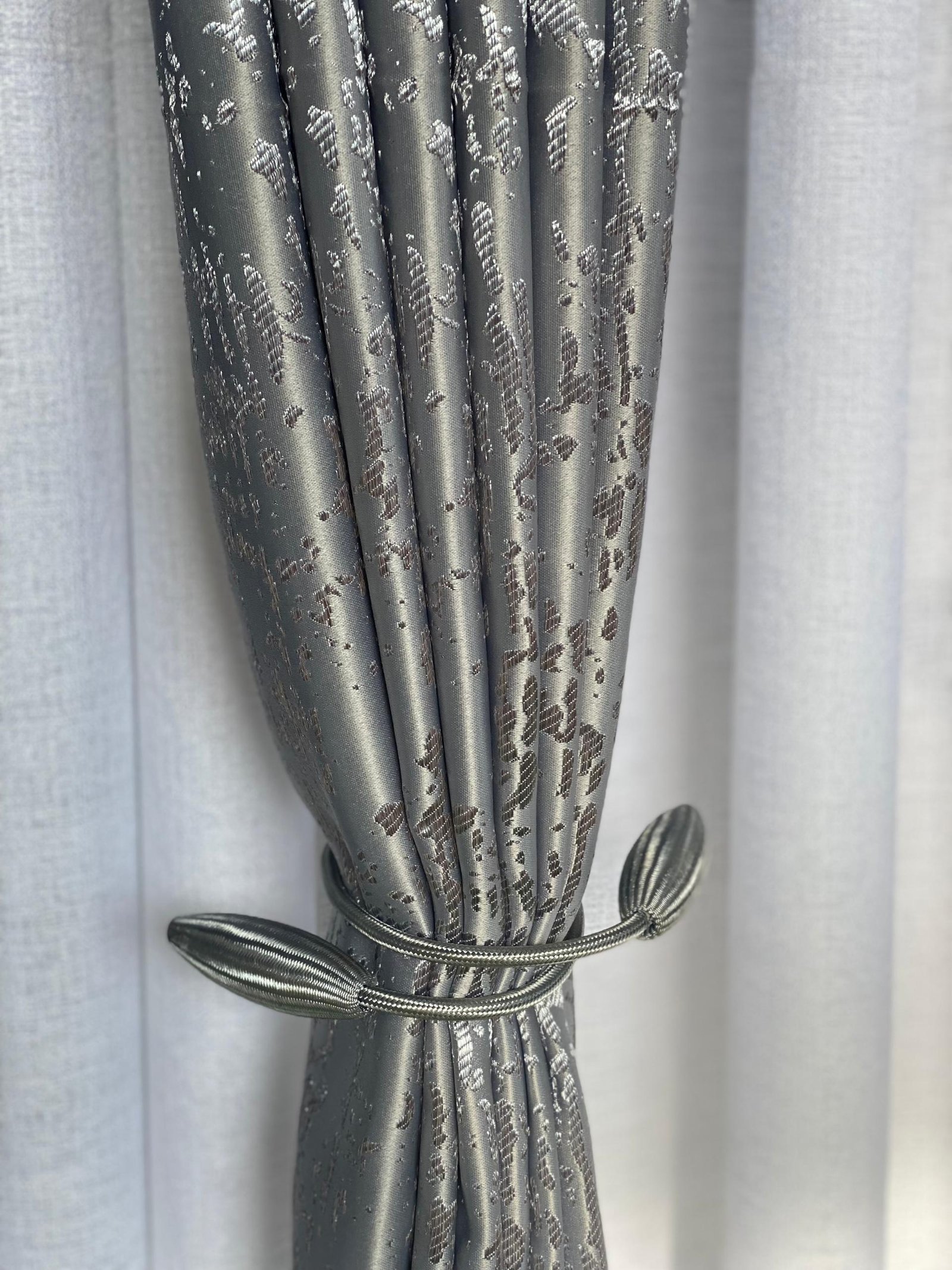 This curtain is a shiny fabric available in different colors with a textured, patterned design that looks like snow streaks. It has a sleek, modern look and adds a touch of elegance to any room. The fabric feels soft yet has a subtle mettalic sheen that catches the light nicely.Its great for giving your space a stylish, upscale appearance.